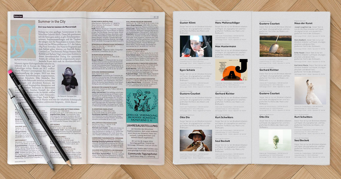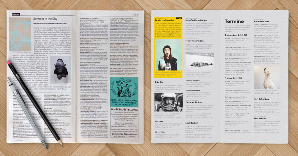 RedesignIch wurde gebeten, ein Redesign für dass Münchner Kunst Magazin ARTMUC zu entwicklen. Weder Format noch Seitenzahl durften verändert werden. Das Magazin sollte auf der einen Seite attraktiver für eine jüngere Zielgruppe werden, musste aber auf der anderen Seite eine höhere Attraktivität für Anzeigenkunden repräsentieren. Daher musste ich auch das bisherige inhaltliche Konzept überarbeiten. Der Fokus musste von Quantität auf Qualität und Empfehlungscharakter gelegt werden. Durch die Reduktion von Inhalten konnte mehr Platz für gestalterische Aspekte geschaffen werden, der die Lektüre des sehr schwierigen Formates erleichtert. Die gedrungene und radikal verengte Typografie des alten Magazines musste einer modernen und dezenteren Schrift und grossen Headlines weichen. Ein weiterer sehr wichtiger Aspekt der Weiterentwicklung war ein radikaler Bruch mit klassischer Anzeigenvermarktung. Anstatt überteuerter Anzeigenformate, die kaum noch Käufer gefunden haben, kann man nun völlig neue Anzeigenformate für geringe Staffel- oder Abonnementpreise buchen.