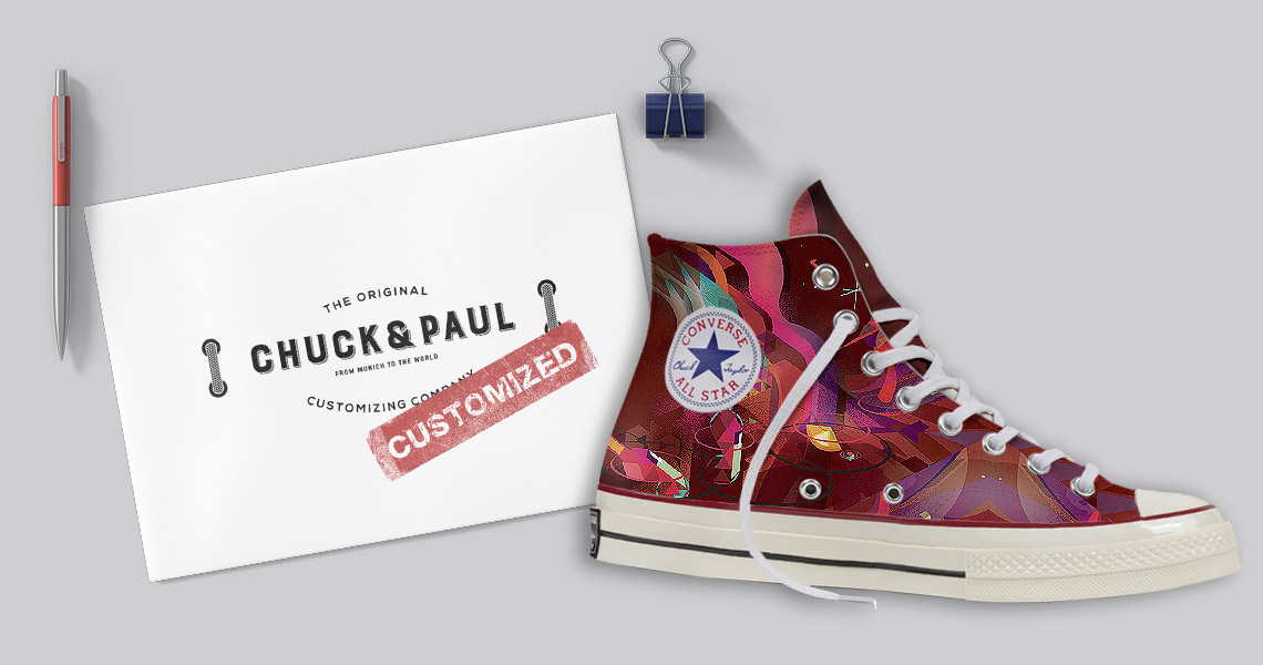 Also haben wir eine Technik entwickelt, mit der wir Chucks in den verschiedensten Formen und Farben customizen können. Um aber dem Kultstatus der Schuhe nicht mit kribbelbunten Mustern zu schaden, lassen wir nur Profis ans Werk. Ausgewählte Künstler und Designer sind bei Chuck and Paul dafür zuständig, dass nur erstklassige Designs auf die limitierten Editionen kommen.