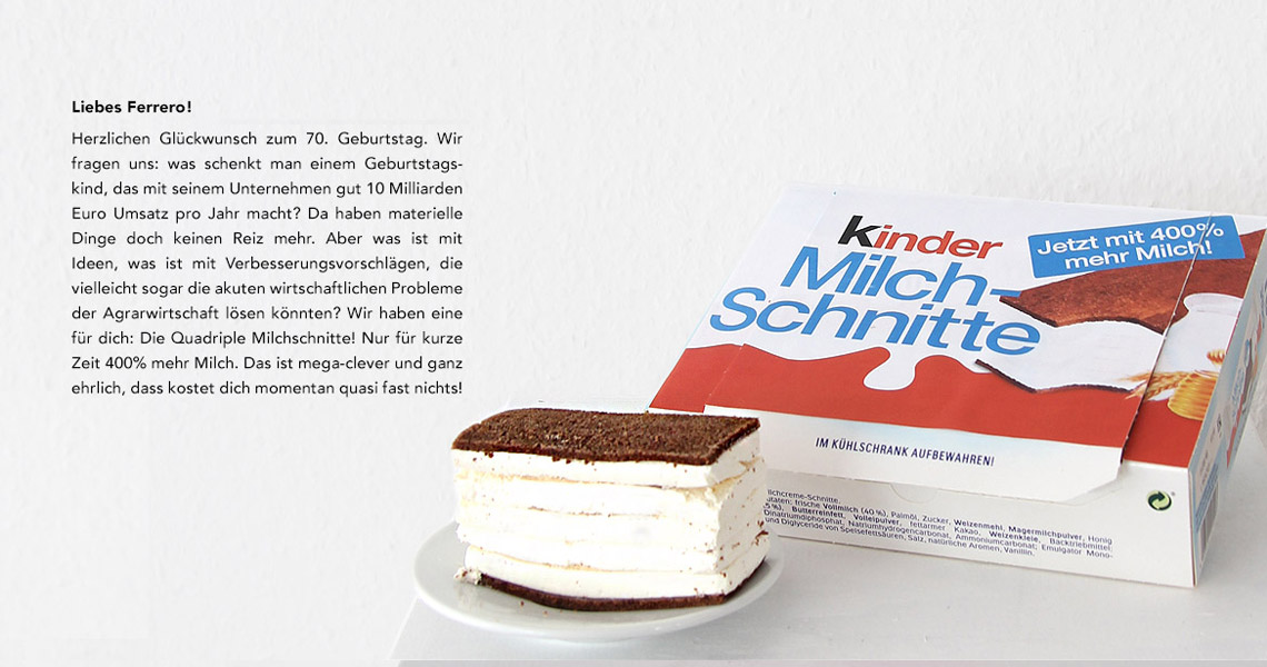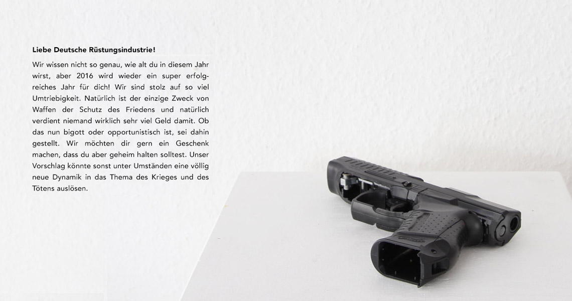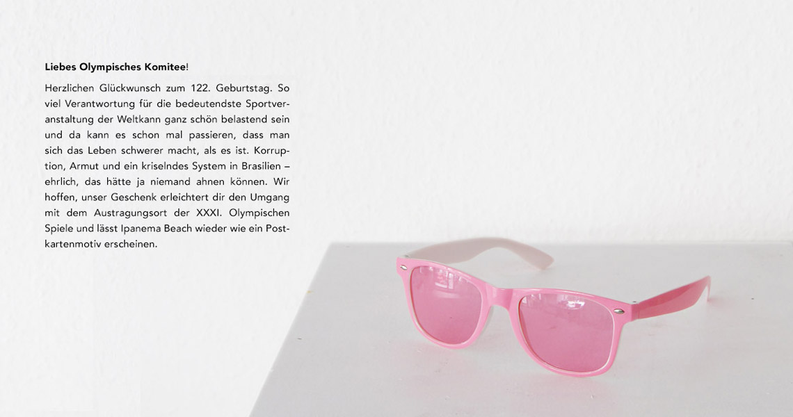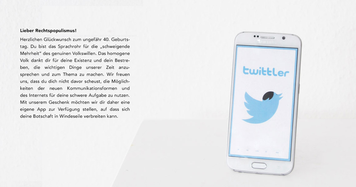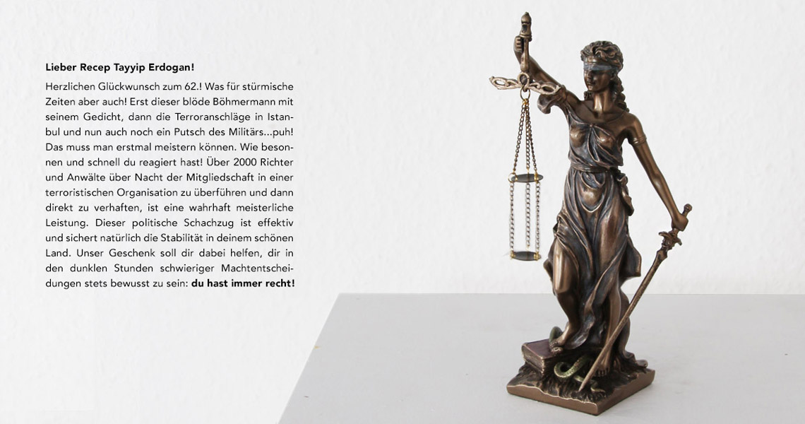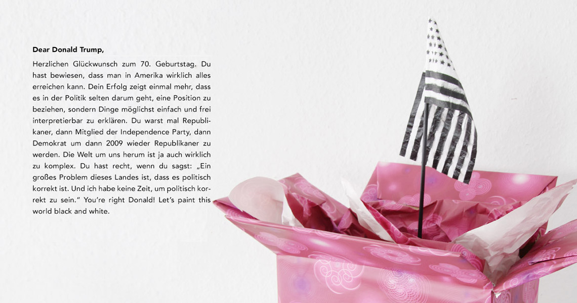 Happy Birthday - Glückwünsche für Besonderes.Für eine Open Air Ausstellung in München haben wir uns entschlossen Geburtstagsgeschenke zu verteilen. Wichtige Ereignisse und Personen sollten eine kleine Aufmerksamkeit von uns erhalten. Ganz in der Tradition der Ready-Made bildeten "Alltagsgegenstände" die Basis unserer Schenkung. Die Themen des Sommers 2016 waren unter anderem ein erstarkender Donald Trump, ein gerissener Erdogan, ein nicht enden wollendes Bauprojekt in Berlin, die Nebenwirkungen der Olympischen Spiele, die Deutsche Waffenindustrie, Twitteraktivitäten der AfD oder der dahin darbende Milchpreis.