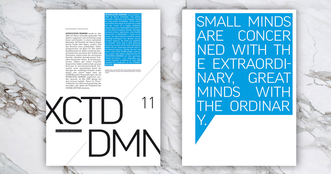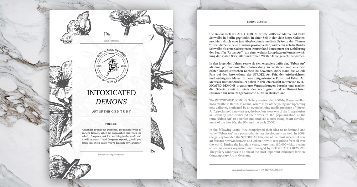 Corporate Design & IdentityIn 2006 i founded INTOXICATED DEMONS in Berlin. In a time, where most of the young and upcoming new galleries, motivated by an overwhelming media presence of „Street Art“, proclaimed a new art era, i was one of the first gallerists in Germany who dedicated his work to the popularization of the term „Urban Art“ to describe and establish a more complex art development of the late 80s, the 90s and the early 2000.