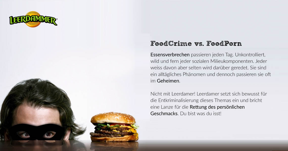 Essensverbrechen passieren jeden Tag. Unkontrolliert, wild und fern jeder sozialen Milieukomponenten. Jeder weiss davon aber selten wird darüber geredet. Sie sind ein alltägliches Phänomen und dennoch passieren sie oft im Geheimen. Nicht mit Leerdamer! Leerdamer setzt sich bewusst für die Entkriminalisierung dieses Themas ein und bricht eine Lanze für die Rettung des persönlichen Geschmacks. Du bist was du isst! (...)