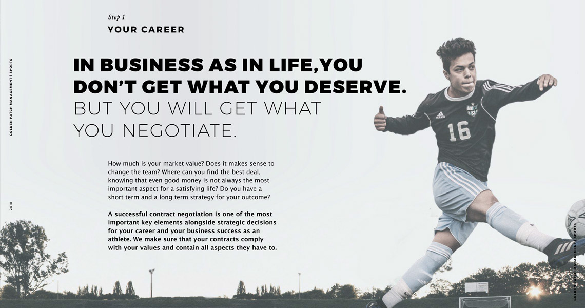 Präsentation für die Spieler-Management Unit der Agentur(...) The Golden Patch is more a family than just another sport management company. We are united by our passion for the sports and the sense for culture and lifestyle. We just don't work with each other, we join forces to challenge the status quo and achieve the impossible. What does it take to join? Built on integrity, loyalty and passion, the Golden Patch Management merges outstanding talents and unique minds to a bigger idea. We don't believe in people as single units, we're more like a hive. We create successful and sustained partnerships to help our partners to thrive in every area of their life. We care for each other, fostering individuality in a bigger networking context to enable opportunity for all. At Golden Patch you are not just a client, you will become an important part of a fast growing international family. Welcome home!